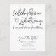 Your guests won't be able to resist smiling when they receive this one-of-a-kind save the date postcard in the mail. It's the ideal way to let them know that your wedding is all about celebration, great company, and those unforgettable, comical dance formations. The front of the card reads "Celebration, libations and comical dance formations" and is customised with your wedding details on the front and backside of the card.