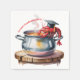 A whimsical watercolor illustration of red crawfish wearing black graduation caps emerging from a steaming silver cooking pot. The crawfish are rendered in bright red with detailed claws and antennae, each wearing a small black graduation cap with tassels. The pot sits on a wooden stump with visible rings and a warm brown color. Steam rises from the pot in wispy gray clouds. The pot has two handles on either side and sits on a light wooden surface. The illustration has a soft, painterly quality with visible brush strokes, particularly in the water and steam. The background is minimal, focusing attention on the main elements of the crawfish and pot. The crawfish are arranged in a curved pattern around the pot's rim, with their claws raised and antennae swaying in the steam.