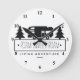 Unique camping wall clock for RVing campers who like to travel- Rustic black and white camping design features a classic vintage travel trailer silhouette and pine trees. Reads ROAM SWEET ROAM below in whimsical letters. Play on classic quote Home Sweet Home. Black clock face numerals. Option to customise text. Unique retirement gift for retiree roam around in their RV. Or nice gift for any RVers or camping addicts. Option to add a background colour as well! Unique camping home decor that would be perfect in an RV, log cabin, or fifth wheel camper. Great RV business office clock or for an RV salesperson. Just add business name, personal name, or slogan.