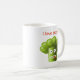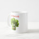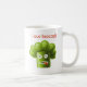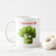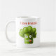 Funny broccoli mug with a big eyed cartoon broccoli in distress, waiting to be eaten and the customisable text "I love broccoli". This funny broccoli mug will appeal to a vegetarian, vegan and everyone who loves broccoli. This crazy broccoli illustration is part of my series with three funny vegetables.