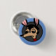 Funny dog graphic illustration round pin back button. Background colour can be customised.