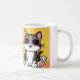 Funny Cat coffee cup Cartoon cat bright yellow background with doodled fishbones and paw print
