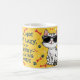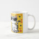 Funny Cat coffee tea ceramic cup Cartoon cat bright yellow background with doodled fishbones and paw prints.