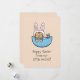 Funny Cat in Bunny Costume with a little mouse in a pocket illustration Easter Greeting Card with funny Easter text: "Hoppy Easter from our little pocket!"