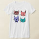 Colourful fun tee with four cat faces. One cat is wearing sunglasses. Fun shirt for any cat lover.