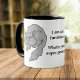 This funny mug will bring a smile. The image is of a lounging grey cartoon house cat with yellow eyes and a contented smile. The text in black reads "I am cat furniture. What's your super power?" Your cat loving friends will totally understand! The cat image is repeated twice on the mug, with the text in the middle.