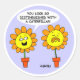Funny Caterpillar Moustache Cartoon Classic Round Sticker depicts cute female flower and her husband or boyfriend, each in a tiny orange flowerpot against a lavender or pale purple background. Female says to proud male who has caterpillar crawling under his "nose" appearing like a moustache, "You look so DISTINGUISHED with a caterpillar!" Cute sticker featuring gentle husband and wife, boyfriend and girlfriend, or male and female humour can be used in a variety of ways, including putting at the bottom of a letter or on the flap of an envelope you plan to send to any guy who sports facial hair, especially a moustache. Perfect stickers for use by gardeners, florists or anyone who enjoys flowers.