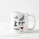 An adorable coffee mug featuring the words Cats Yoga Wine with cute cartoon drawings of each. Makes the perfect gift for a woman who loves wine, yoga and her cat (and coffee of course).