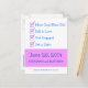 This funny Save-the-Date postcard features a checklist of important events that lead up to the big day. Text is light blue on white and blue on pink. Alternate version available in red and black: