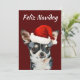 This funny holiday card features a realistic watercolor Chihuahua sporting a Santa hat on a rich dark-red background — topped with customisable “Feliz Navidog” text for maximum giggles.