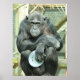 A cute chimpanzee who has a CD but unfortunately no CD player.