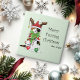 Cute calico cat dressed up in Christmas holiday lights, stuffed antlers, Christmas Santa hat, and a big green bow against a backdrop of light green, The kitty is not happy!
