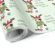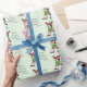 Cute calico cat dressed up in Christmas holiday lights, stuffed antlers, Christmas Santa hat, and a big green bow against a backdrop of light green, The kitty is not happy!