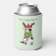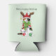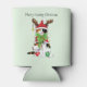 Cute calico cat dressed up in Christmas holiday lights, stuffed antlers, Christmas Santa hat, and a big green bow against a backdrop of light green, The kitty is not happy!