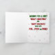A cartoon Christmas greeting card with a cartoon of Santa looking through a hole in the roof as a result of coming in a little rough. The inside of the card reads “Wishing you a very Merry Christmas and Happy Holidays filled with fun…food and family.