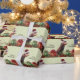 A cute photograph of a young red laying hen with reddish orange feathers wears a red and white fluffy santa hat and is surrounded by prettily wrapped gifts and packages topped with fancy ribbons and bows.