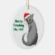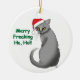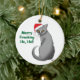 A grey cat wearing a red Santa hat. The grey cat is grumpy about Christmas