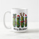 A cute, fun mug to drink your coffee or hot chocolate in this holiday season! Christmas pickles in jars wrapped in Christmas lights and dressed in Santa , snowman and reindeer hats.