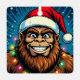 A funny Bigfoot Christmas metal ornament with a comic book style pop art sasquatch smiling with a Santa and Christmas lights on. You can personalized a message on the back.