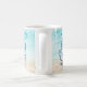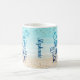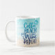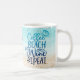 This fun summer coffee mug features text image "Coffee Beach Wine Repeat" in blue ombre glitter on a beach watercolor background. Add your name along the side to personalise, or delete name for a clean look.