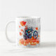 Funny coffee mug with grey background showing Marlee (EcoMarlee) mascot riding her motorcycle with the words " I cherish every leaf I run over"