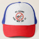 This hat has a prohibitory traffic sign with a cartoonish flying saucer and a stylised pyramid on a white background, crossed by a red "forbidden" line. The sentence "aliens did not do it" in capital black letters runs all around the sign in a quirky retro game font.