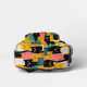 This cute backpack for kids or adults has a pattern of funny cartoon cats in bright colours. Colours used include gold, orange, blue, pink, white, and black. The top of the bag is solid black, making a nice contrast for all the colour. Sure to bring a smile!