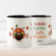 This playful Thanksgiving-themed mug features a vibrant, colourful turkey illustration adorned with rustic fall leaves. The turkey, adorned with bright feathers and big eyes, is designed to bring joy. The mug showcases the cheerful slogan 'Gobble Gobble, Let's Wobble!' in a fun, whimsical black font that adds to the festive theme. Fully customisable, you can personalise every word of the text and add a date or a name to make it unique. It's the perfect drinkware for Thanksgiving gatherings or any festive occasion.