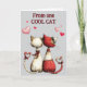 On the front of this cute Valentine Day's card is an adorable image of the backs of two rag doll cats. Each has a valentine heart at the end of their tail. Around the cat are floating pink and red hearts, and the text above says "From one COOL CAT". The inside of the card finishes the sentiment with the image of another "cool cat". This is an appealing card that isn't overly romantic, but you may easily change any of the text to anything else you'd prefer.