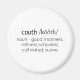 Funny Couth Humour Definition Magnet is perfect for your home office to post important notes. I was inspired to create this design because my mother always said this saying when I was a little girl. When she would see someone not acting acting appropriate, sophisticated or well mannered, she would say, "They don't have any couth!" The typography design has "couth: noun, good manners, refined, schooled, cultivated, suave" in simple black print lettering on customisable white background.