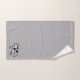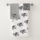 This great set of towels feature a fun cartoon illustration of a black and white cow. On the bath towel, the cow is tiled in a pattern on a white background. On the hand towel the cow is on the bottom right on a light grey background. On the washcloth the cow is on the bottom right on a medium grey background.