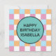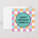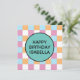 Cool, blue, orange white, and pink chequerboard pattern and a text template. To edit, click personalise and change the words.