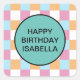 Cool, blue, orange white, and pink chequerboard pattern and a text template. To edit, click personalise and change the words.