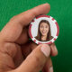 Love the poker chip. It looks just as it appears on the web. It feels about the weight of a casino poker chip. Only difference is the texture of the middle. Overall, very happy with our purchase. Printing turned out perfect. Colors look great, and the text and imaging is all centered very nicely.