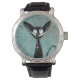 Funny Cute Black Cat Art on Blue Damask Watch