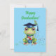 A cheerful, big-eyed frog wearing a tiny graduation cap, with a diploma in one hand. Above the frog, bold, playful text reads: "HOPPY Graduation!" 🎓🐸.