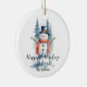 Funny Cute MInimalist Snowman Frosted Forest Christmas Ceramic Ornaments with Family Photo in the Back.