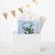 Personalised birthday favour bags. Cartoon frog dancing on a lily pad. Cartoon toad dancing with a birthday hat on.