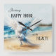 Wall clock featuring a painting of a funny dancing cockatoo parrot on the beach. A beautiful clock for a beach house or a gift for a beach lover.