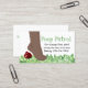 Funny dog clean up business card done in white with graphics of feet stepping on a pile of dog poop, on watercolor graphics of grass. Personalise the custom text, front and back, for your small business needs.