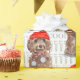 A cute brown Cockapoo sits with a cute red winter hat and a striped bow is ready to wish Fleas Navidog to any dog lover or pet lover.