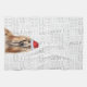 Here's a fun holiday kitchen towel or year-around hand towel. An adorable watercolor illustration of a Afghan Hound dog who sits with a fun 'woof' word art background. The dog wears a Santa hat.