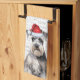 Here's a fun holiday kitchen towel or year-around hand towel. An adorable watercolor illustration of a Schnauzer dog who sits with a fun 'woof' word art background. The dog wears a Santa hat.