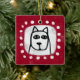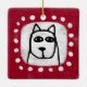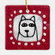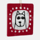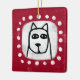 A cute drawn dog in black and white over a red textured background surrounded with white dots.