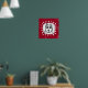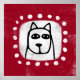 A cute drawn dog in black and white over a red textured background surrounded with white dots.