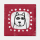A cute drawn dog in black and white over a red textured background surrounded with white dots.