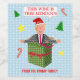 On this humourous Christmas gift wine label design, US President Donald Trump holds out his hands while emerging from a gift box and wearing a Santa hat with his MAGA slogan on it. He says, "This wine is tree-mendous." He's surrounded by little trees, stars, and candy canes. Add your text along the bottom.