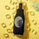 Bottle Cooler Koozie Sleeve printed with Funny Drunk Halloween Full Moon Bat is a funny and whimsical image drawing of an adorable wonky black bat flying past the big full harvest moon on his way back home after enjoying a crazy creepy scary spooky fun blood sucking Halloween night out on the town and trick or treating. Color palette tones of black, gray, blue, white, tan, cream, yellow, red and purple are drawn into this illustration.