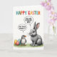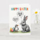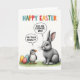 This card shows a digital illustration on a bright white background, with a large gray hare on the right and a small dark-feathered chick on the left standing close together on a strip of green grass 🐰. The hare’s fur is finely textured, its tall ears show soft pink inside, and its wide eyes lean toward the chick as if sharing a tired, affectionate joke. The chick has a round, fluffy shape with a bright orange beak and tiny feet, and it angles its gaze toward three decorated eggs beside it as though proudly presenting them to a friend 🐇. The eggs sit near the chick in yellow, teal, and red stripes, adding patterned color against the simple setting. Across the top, the words “HAPPY EASTER” appear in large, multicolored letters spaced evenly above the characters. Near the chick, the text “ARE THOSE, ROCKS,?!!” is placed like a spoken line, and near the hare, “EGGS ARE EXPENSIVE, BRO!” appears as the reply in matching dark lettering. The hare’s ears tilt slightly back while the chick leans forward, and the trio of eggs rests in the grass with crisp stripes and dots.