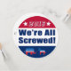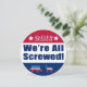 in white outlined in blue. The centre white section has text that says, "We're All Screwed!" in blue